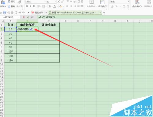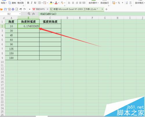 2、下面先介绍有角度转弧度:选中B2单元格,在编辑栏中输入公式“=RADIANS(A2)”(A2表示:A列2行的角度),如图所示;