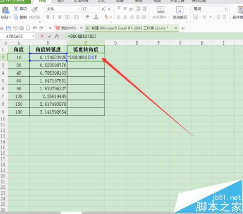 6、接下来介绍有弧度转换为角度的方法:选中C2单元格,在编辑栏中输入公式“=DEGREES(B2)”(C2表示:C列2行的弧度),如图所示;
