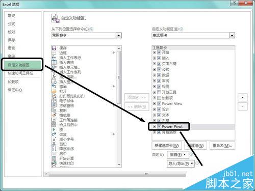 3、勾选“Power Pivot”复选框。弹出“Excel选项”对话框,单击“自定义功能区”选项,在右侧面板的列表框中勾选“Power Pivot”复选框,最后单击“确定”按钮,如下图所示。