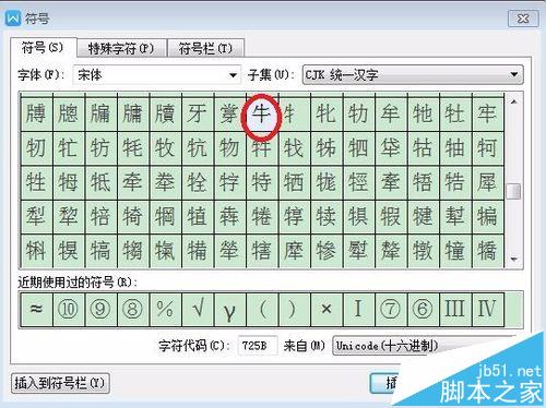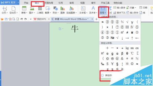 2、选中牛字,然后点击插入——符号——其他符号