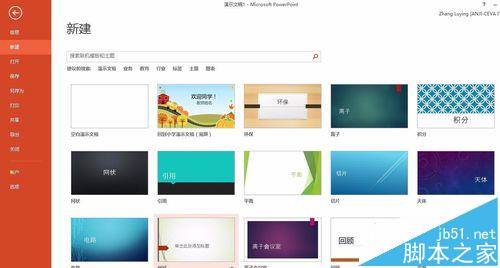 1、小编以Microsoft Office PowerPoint 2013为例,新版本功能更强大,点击最上方的菜单“文件”,然后在弹出的快捷菜单中,点击“新建”,此时可以看到会显示出很多的模版,另外大家还可以通过搜索框去搜索需要的模版;