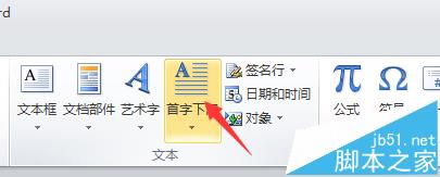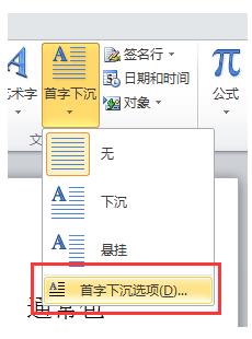 2、打开“插入”工具栏。在“插入”工具栏里,倒数第五个是“首字下沉”工具,它就是我们的秘诀所在。单击这个工具下方的小箭头,再单击下拉菜单最下方的“首字下沉选项”。