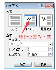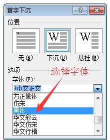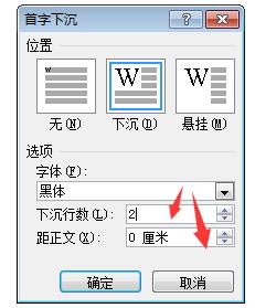 接下来我们就对选定的字进行更改,使之符合你的要求。我们可以更改的设置有:位置和字体。位置我们选择“下沉”,字体方面看你喜好,我这里选择为黑体。下沉行数表示这个字将占据的行数,一般选择两行,看起来最舒服,距正文一般选择默认(0厘米)就好。最后记得点确定。