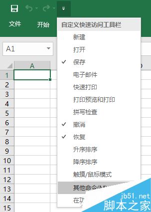 这里以Excel 2016为例,点击左上方“自定义快速访问工具栏”下拉按钮,从下拉菜单中选择“其他命令”。