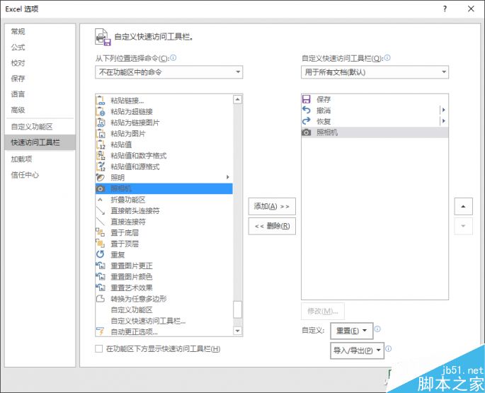 在打开的选项对话框中,左侧选中“快速访问工具栏”,中间列表中找到并选中“照相机”,然后点击“添加”将其添加到右侧列表中。