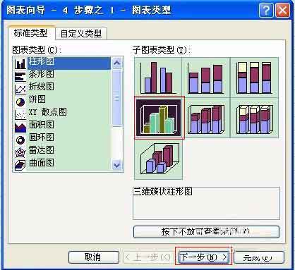 3、这时,选择图表类型,如三维簇状柱形图,并点击“下一步”。