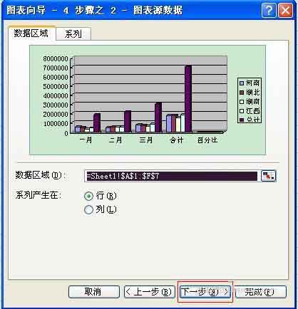 4、这时将叫你选择图表源数据,由于我们第一步已经选择了,这时直接点击“下一步”。