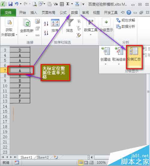 1、首先我们把光标定位在需要合并数据区域的任意位置,因为数据区域是连续的,excel会自动判定当前区域为操作区域,然后选择数据选项卡中的分类汇总,这个我想大家是很数据他的作用的。分类汇总,基本的应用。