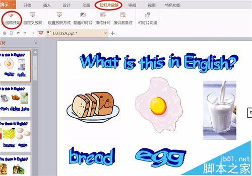 7、再次点击“从当前开始”播放幻灯片,这时鸡蛋的动画就最先呈现了,动画的先后顺序就是这样设置的。