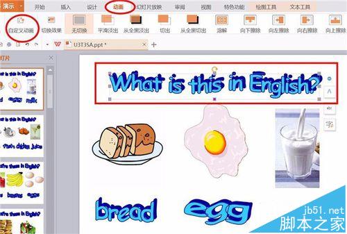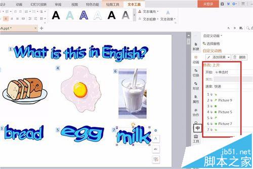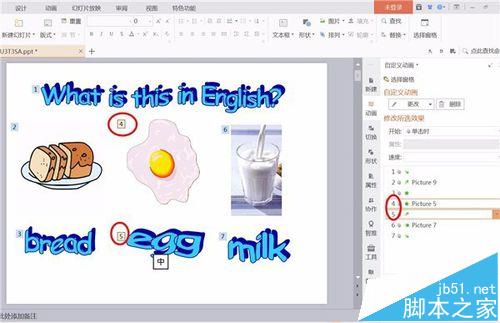 6、如果想要调换出现的顺序,我们可以直接在右边拖动即可。比如,拖动鸡蛋动画到第二项(按住Ctrl键可以选择多个),那么鸡蛋出现的顺序就会在面包之前了。如果不清楚哪个数字对应哪个动画,可以看图片或文本框右上的数字即可。注意对比下面的两幅图片哦。