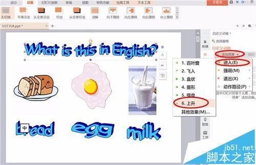 4、点击“添加效果”下的“进入”,再点击“进入”下的“上升”效果。