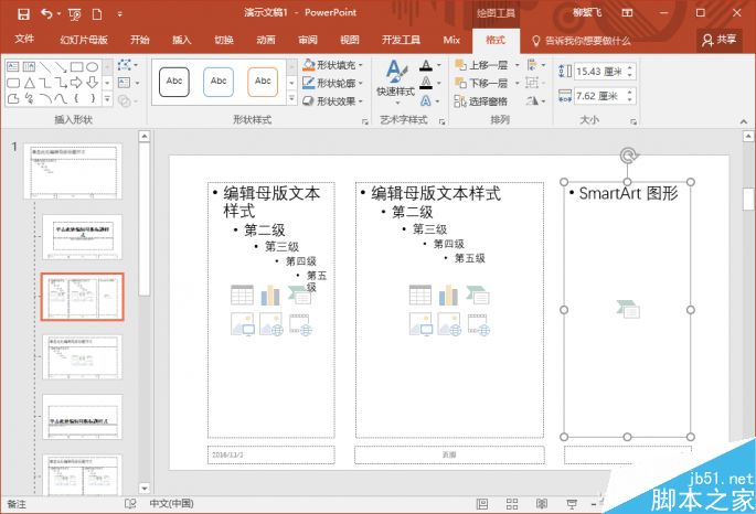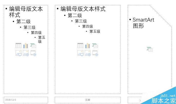 这样,一个定制的三栏带不规则版面的幻灯片版式就制作完成了,这是默认版式中所没有的。