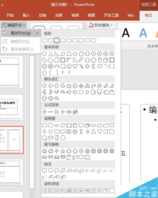 选中这个SmartArt图形,切换到“绘图工具-格式”选项卡,点击工具栏“编辑形状→更改形状”,就可以为此SmartArt选择一个有趣的不规则图形了。
