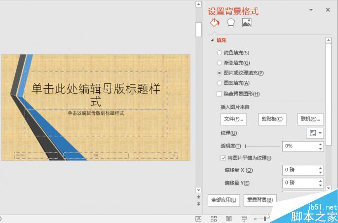 第三种方法就是,在幻灯片空白处右击,选择“设置背景格式”,再在右侧打开的窗格中,为背景填充颜色、渐变、图案。也可以点击“插入图片来自”下面的“文件”按钮导入背景图片,与前面不同的是,它将会自动置底并铺满幻灯片。