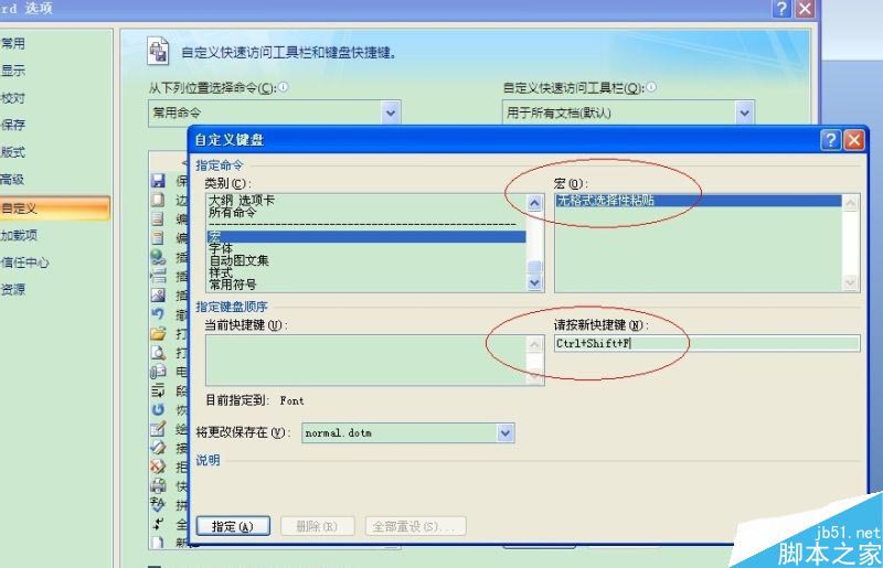 在左侧“类别”里面下拉选择“宏”,右侧找到刚才我们创建的“无格式选择性粘贴”,在“请按新快捷键”输入你需要的快捷键。我这里按的是Ctrl+Shift+F。
