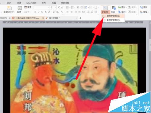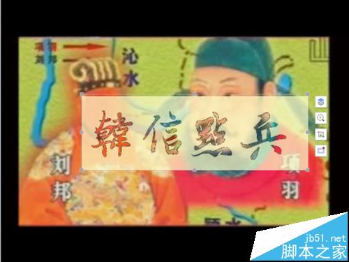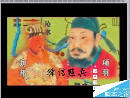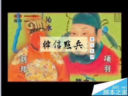 3、接着在文本框中输入文字内容“韩信点兵”,设置字体为王羲之书法字体,字号为60,并调整文本框的位置。