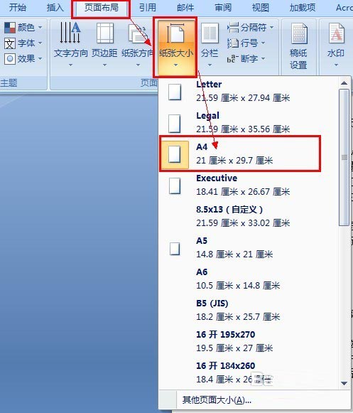 4、依次单击“页面布局,纸张大小,A4”,将电子板报设定为A4大小:
