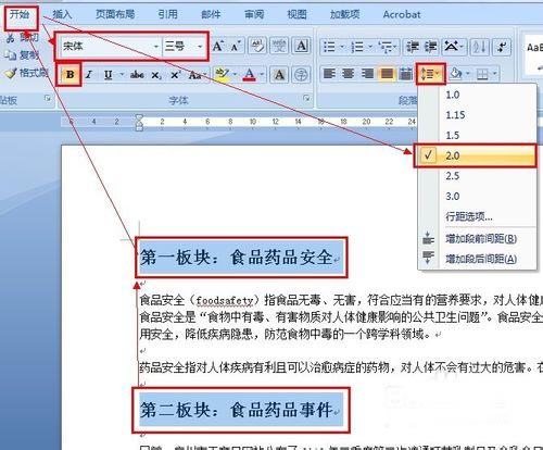 6、选中文字的标题部分(可以按Ctrl键同时单击或者拖拽,选取不同位置的文字),然后单击“开始”,设置文字的大小,字体,和黑体等,然后选择行间距为2.0: