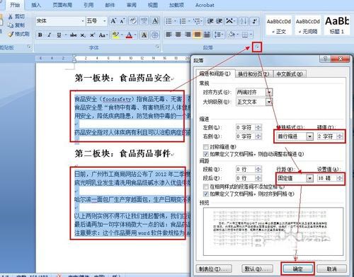 7、选中正文部分,然后单击段落栏的右下角图标,设置首行缩进2字符,和固定值为18磅后,单击“确定”: