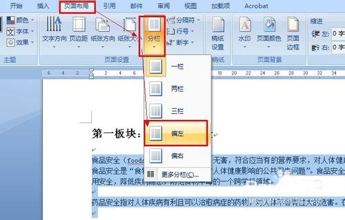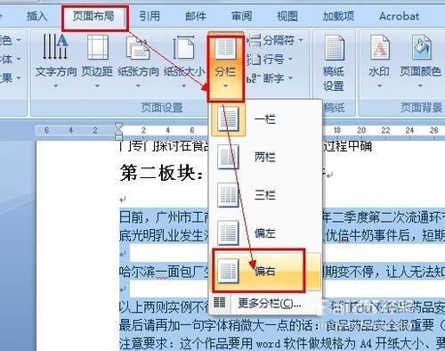 9、将另一部分正文选择“页面布局,分栏,偏右”进行分栏: