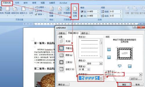 13、依次单击“页面布局,页面边框”,然后选择“方框”,选择合适的艺术型后,单击“确定”: