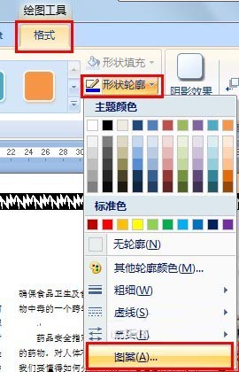 16、继续选择线条,依次单击“格式,形状轮廓,图案”: