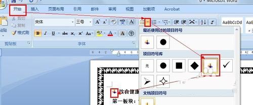 18、在文章的大标题前增加项目符号。依次单击“开始,项目符号”,然后选择喜欢的单击: