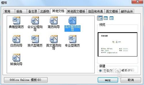 2、打开“模板”对话框,选择“其它文档”选项卡,在 下边找到“名片制作向导”,在右下角的新建栏选择“文档”单选框,选定之后,点击确定按钮;