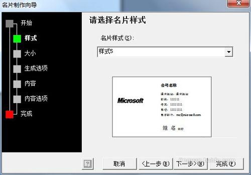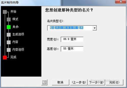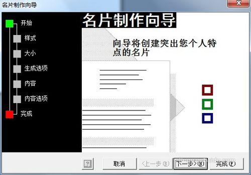 3、打开名片制作向导对话框, 整个制作过程包括开始,样式,大小,生成选项,内容,内容选项,完成等几个步骤,我们单击下一步按钮进行下一步骤设置;