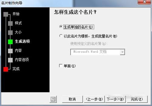 6、进入到“生成选项”对话框,系统将提示你“怎样生成这个名片?”,下面有几个选项, 一个为“生成单独的名片”,另一个“以此名片为模板,生成批量名片”第二种适合于公司为多人制作名片的情况,在“单面”复选框中我们可以设置名片的单双面。设置好后我们点击下一步按钮。