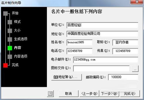 7、进入到“内容”选项,我们可以在右边输入内容,标题中提示:名片中一般包括下列内容;主要包括地址,单位,职称,电话,电子邮件传真等。我们可以按要求填写;如下图所示。在图标栏我们选择我们事先准备好的logo文件。