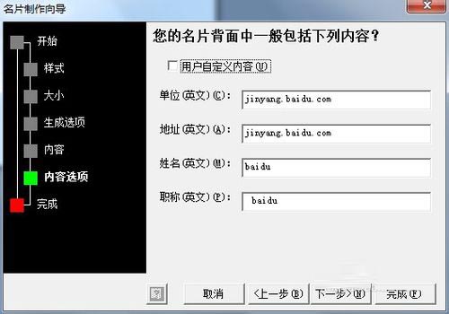 8、设置好后点击下一步,进入到背面内容设置选项,我们按要求填写,我们如果不喜欢这种样式也可选择用户自定义内容,根据我们的需要来设置背面的内容;