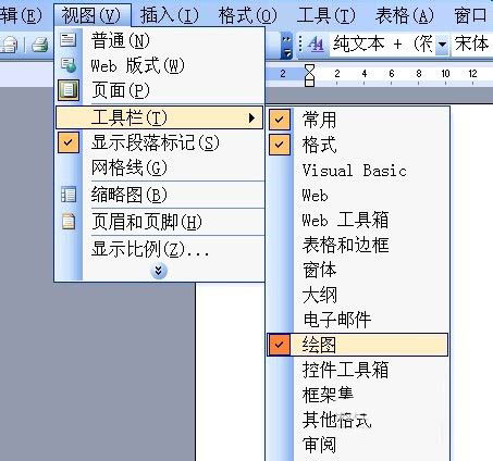 1、打开“绘图”工具栏,方法为点击菜单栏的“视图”-“工具栏”,找到“绘图”,即可调出绘图工具栏;