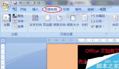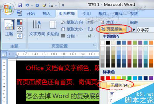 3、然后,再点击“页面布局”选项卡中的“页面颜色”按钮,从弹出的颜色面板中选择“无颜色”即可: