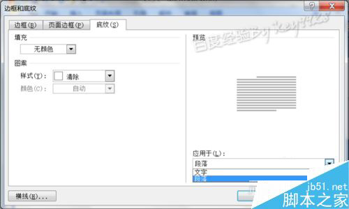 7、在弹出的“边框和底纹”对话框中,切换到“底纹”选项卡。将“填充”改为“无颜色”,将“图案”也改成“清除”,再将右下角的“应用于”改为“段落”,这点务必注意: