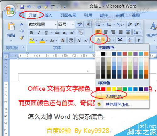 10、再单击“开始”选项卡下的“底纹”,从弹出面板中选择“无颜色”: