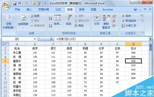 5、这时大家就可以发现,数据以总分降序排列的同时,又以化学成绩进行降序排列。这就是Excel排序的方法,怎么样又详细又简单吧。