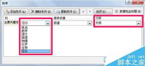 3、在排序对话框中可以选择主要关键字以及次序方式等。