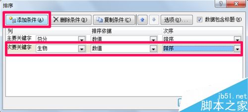 4、点击添加条件后就会出现次要关键字,选择相应关键字和排序方式,然后点击确定。(这里可以添加多个次要关键字)