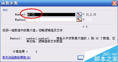 4、打开MAX函数对话框,EXCEL软件相当智能地选择A2到C2这一范围的数据。MAX函数的运用,如果是某一行连续数据的话,可以采用MAX(A:B)的方式;如果是非连续性的,则不能如此,须采用MAX(A1,B2,C3)这样的语法模式。回车之后,可以看返回的结果。