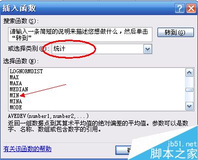 1、MIN函数和MAX函数的操作基本一致的,在函数对话框里,MIN函数并没有出现在常用函数里。要在选择类别里选择“统计”,从而找到MIN函数。