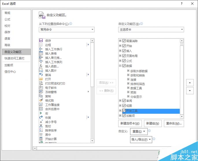 默认情况下,Excel 2016并不显示“开发工具”选项,需要进入“文件→选项→自定义功能区”,再在右侧勾选“开发工具”,点击“确定”返回即可。