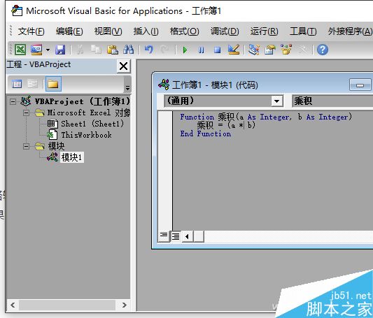 “Function”表示这是一个函数,“乘积”是这个函数的名称,括号内声明了两个参数,分别是整数a和b。中间一行代码是对这两个整数进行相乘运算。最后一行“End Function”表示函数结束。