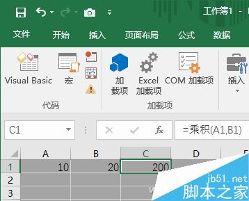 现在回到Excel表格中,来试试自定义的函数。在A1单元格输入10,A2单元格中输入20,A3单元格中输入公式“=乘积(A1,B1)”,果然得出了正确的乘积数。