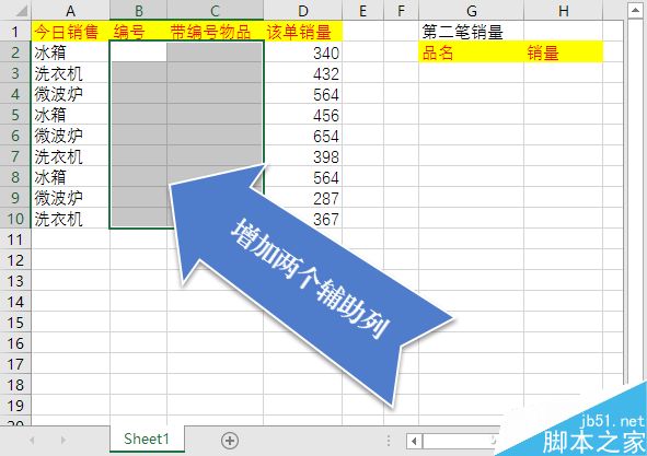 为了便于识别和引用,我们给这个表格添加两个辅助列,其中B列为物品的编号,另一列C则是编号与物品合并生成的带编号物品(具有唯一性)。