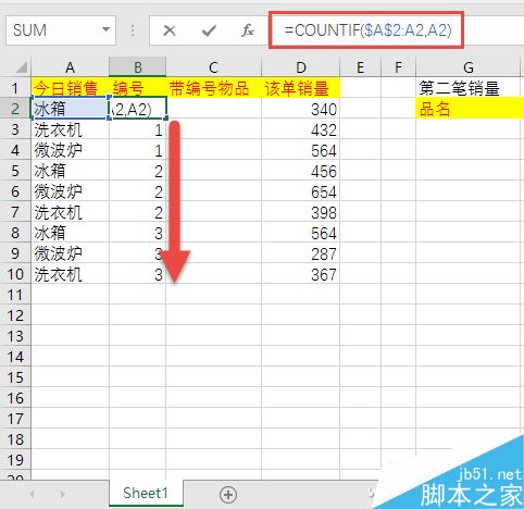在B2单元格中输入公式“=COUNTIF($A$2:A2,A2)”,然后用下拉右下角填充柄的方式填充该列。作用是自动填充每笔所属的笔数序号。