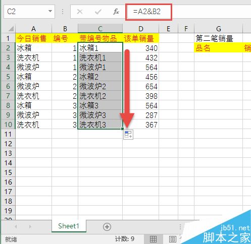 接下来,在C2单元格中输入公式“=A2&B2”,同样用下拉右下角填充柄的方式填充该列。