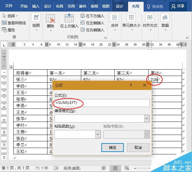 我们以下表为例,如果要对“张三”3天的数据进行汇总,只需在其累计单元格中,通过“布局”选项卡下的公式按钮启动公式框,输入“=SUM(LEFT)”,确定即可计算出左侧数据之和。