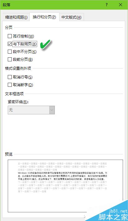 在出现的段落对话框中,单击“换行和分页”标签,选中“与下段同页”复选框,然后单击“确定”按钮。