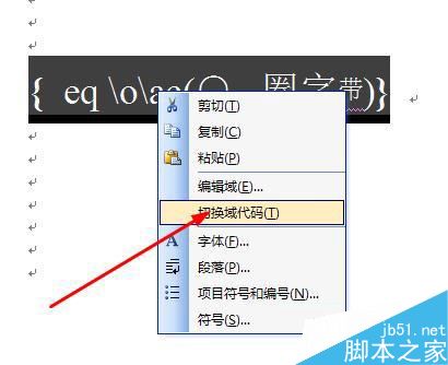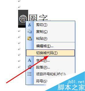 9、我们选中这个带圈的字,然后右键单击,选择切换域代码